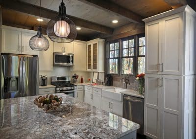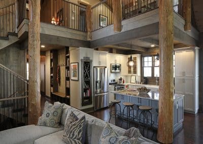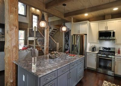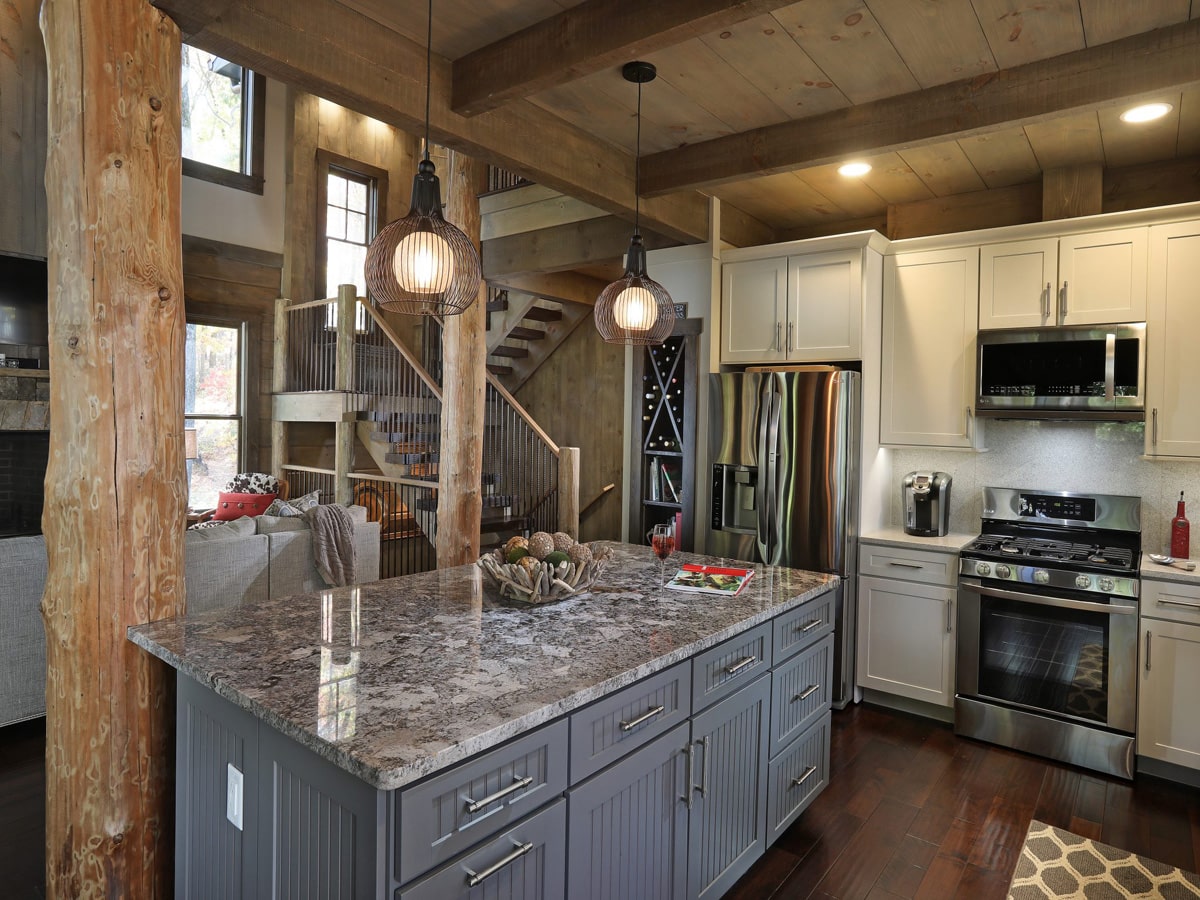 The living room features modern influences, a “must-have” floating staircase, and a central hemlock post. The kitchen is a “two-butt kitchen” with a wide, 5-foot span between the island and the sink to accommodate several cooks.