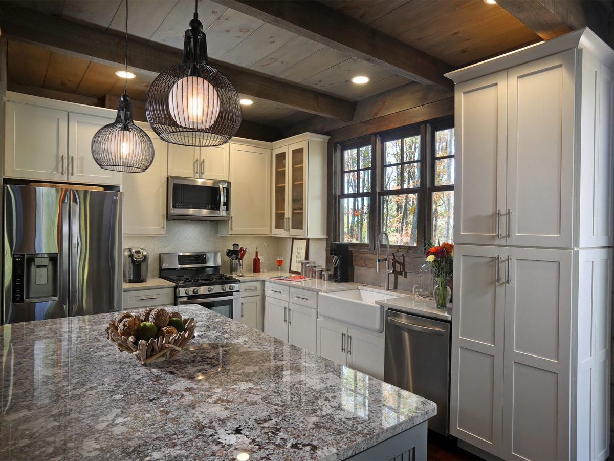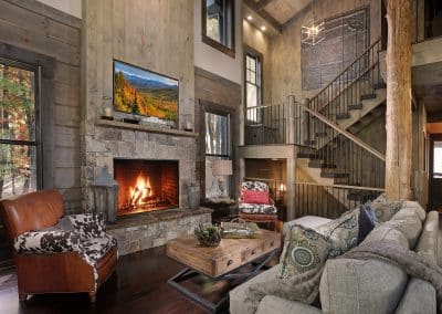 Key Materials: Five species of wood were used, including hemlock and white pine, and the stain features gray undertones that complement the stonework and provide a stark contrast to typical honey-toned choices.