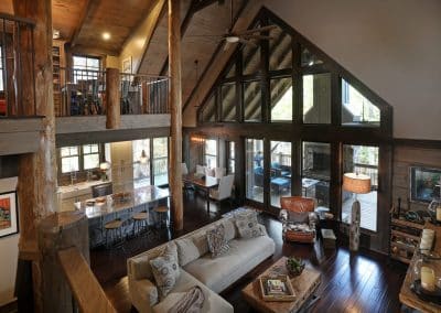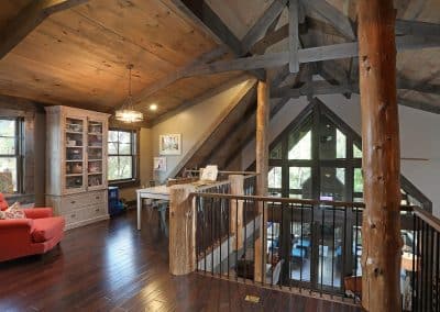 Upon entering your eye is drawn to the living porch fireplace which is on the opposite end of the cabin. This long sight line is enhanced by the architectural detail of the paneled walls, art alcove and built-in bench and shelves. The Hemlock tree trunks at 28 feet tall support the timber frame details of the ceiling as well as the open loft which functions as a studio space for art projects.