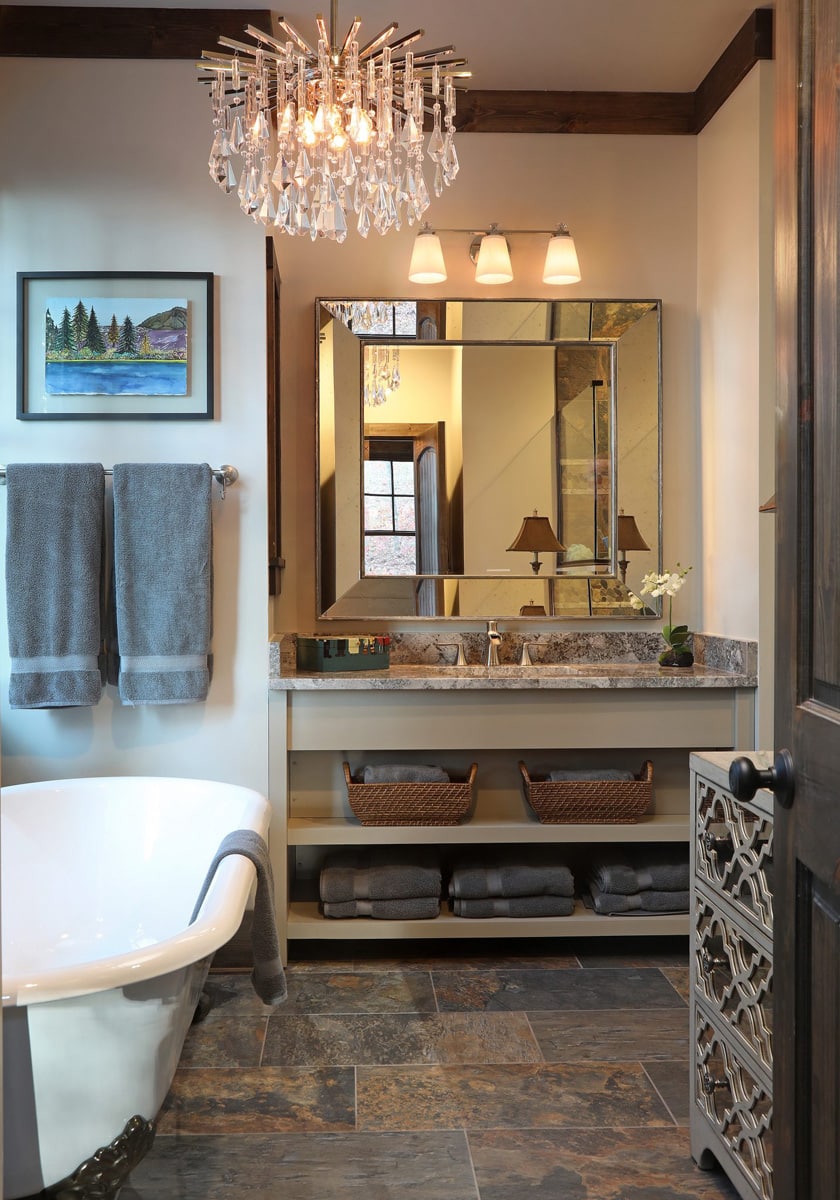 The master bath is “distinctly feminine,” featuring a clawfoot tub and a crystal chandelier.