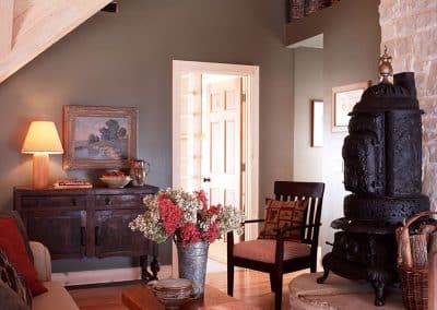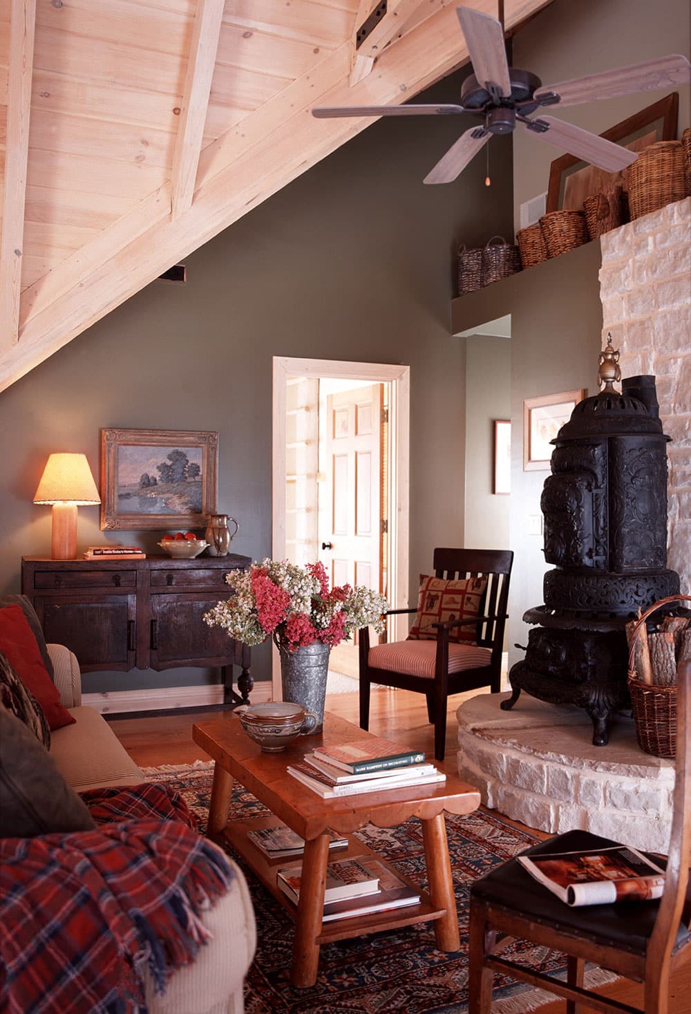 The Great Room is the heart of the log cabin, featuring a soaring 26-foot vaulted ceiling that opens to the kitchen, dining area, and study. Varying ceiling heights define each space, while a Texas Hill Country limestone fireplace creates a warm focal point. The centrally located kitchen offers ample storage and keeps everyone connected. A farm table with mismatched chairs invites relaxed meals and conversation. A loft den overlooks the Great Room, perfect for reading or games, while a rustic white cedar staircase adds charm. The bedroom’s rooflines feel cozy, the vintage bathroom evokes the past, and the porch fireplace extends gathering outdoors year-round.