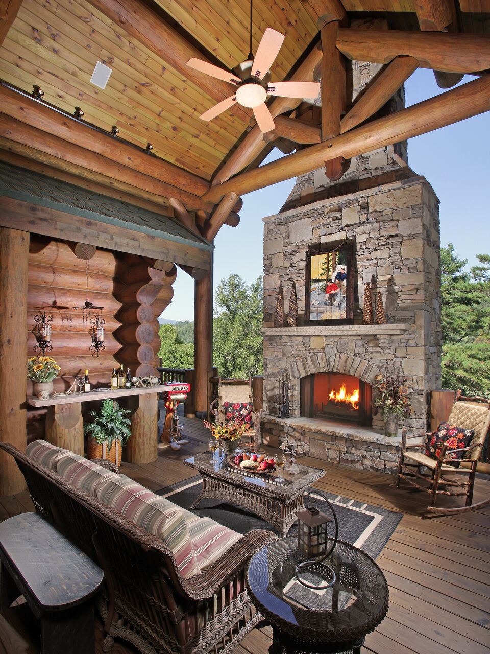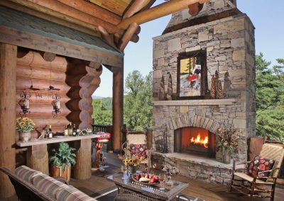The Ponderosa Lodge makes a powerful first impression, commanding attention the moment you cross the bridge leading to the property. Built from hand-crafted Douglas Fir logs sourced from British Columbia, the lodge is substantial in scale while remaining perfectly balanced with its surroundings. Its architecture is deeply tied to place, with roof lines that echo the rolling forms of the Blue Ridge Mountains that frame the home. Natural materials were chosen with intention, from the warm timbers to the full masonry fireplaces constructed of stone harvested locally in North Georgia. Together, these elements create a lodge that feels timeless, grounded, and unmistakably connected to its landscape.
