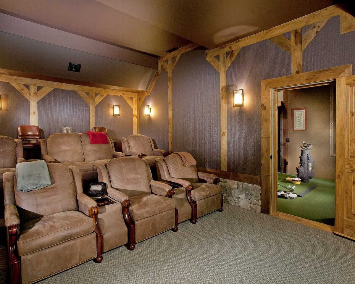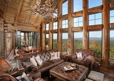 Designed by Michael Grant and built by Modern Rustic Homes , the lodge features an imposing profile. It is characterized by hand-hewn white pine logs with French dovetail corners, timber-frame elements, and indigenous stone. Architectural details like stone turrets, a synthetic slate roof, and enchanting shutters contribute to its charm.